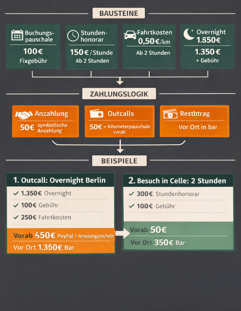 - Für Outcalls bekomme ich die Fahrtkosten und die Buchungspauschale im Vorfeld (€100,- zzgl. Kilometergeld).